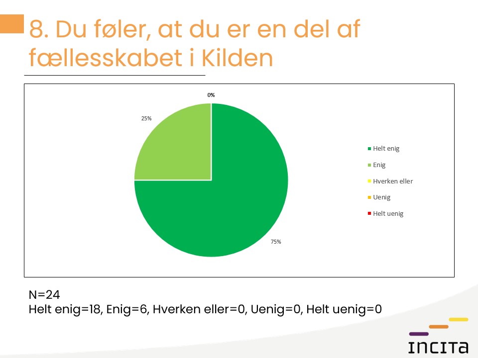 Kildens tilfredshedsundersøgelse gennemføres hvert 2. år. I 2025 er der lavet et helt nyt skema, der indeholder 19 spørgsmål, herunder 4 åbne spørgsmål. Spørgsmålene er grupperet i temaer med baggrund i Kildens værdigrundlag, der udspringer af Fountain House-modellen og omhandler Mangfoldighed, Tryghed, Ligeværdighed, Fællesskab og Udvikling. Der er derudover tilføjet temaer om arbejdsidentitet og fysiske rammer for at dække yderligere emner, der specifikt er relevante for Kilden. Selve undersøgelsen er gennemført som interviews af Kildens frivillige af Fondens Incitas kvalitetskonsulent.