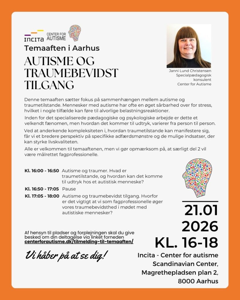 Årets første temaaften i Aarhus! Vi glæder os til at invitere dig til temaaften om autisme og traumebevidst med specialpædagogisk Janni Lund Christensen. Vi er stolte af at kunne introducere vores næste temaaften hvor vi sætter fokus på sammenhængen mellem autisme og traumetilstande. Arrangementet er åbent for både fagpersoner, pårørende