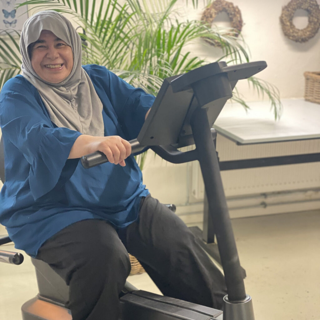 Vi har derfor en sidde-motionscykel, som gør træningen tilgængelig og tryg.