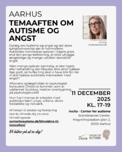 Incita – Center for Autisme afholder løbende spændende temaarrangementer om autisme. Her tager vi fat på emner som sansebearbejdning, angst og meget mere. Hold øje her på siden for inspiration og nye datoer – i efteråret kan du fx glæde dig til en temaaften om overgangen fra ung til voksen med Inge Louv den 29. oktober 2025.